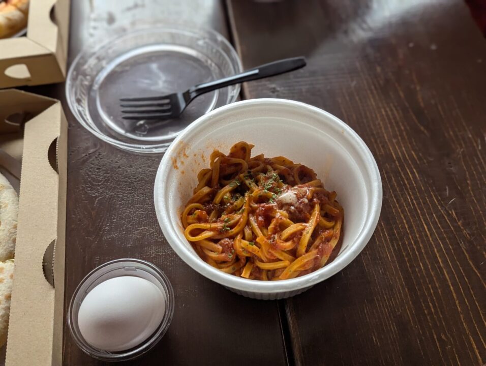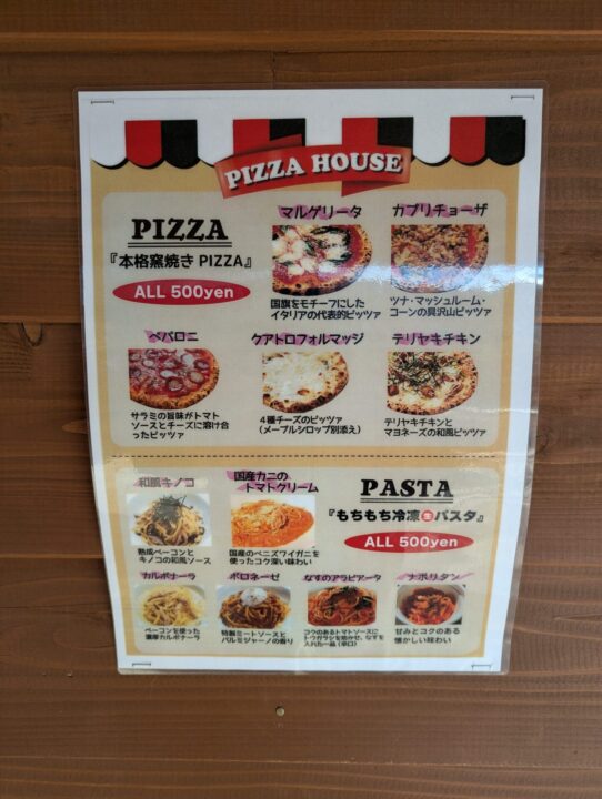 本格窯焼きピザが1枚500円、冷製パスタも500円で購入できます。